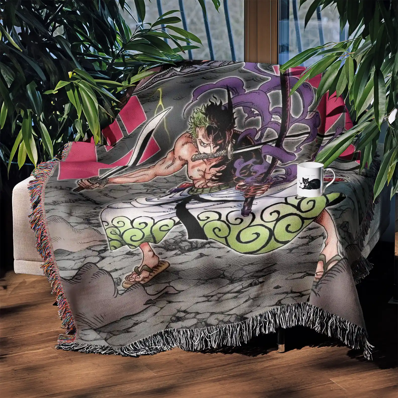 The One Piece Zoro Woven Tapestry Throw Blanket features fierce woven wall art, perfect for room and home decor, making it a striking collectible throw and ideal gift for fans.