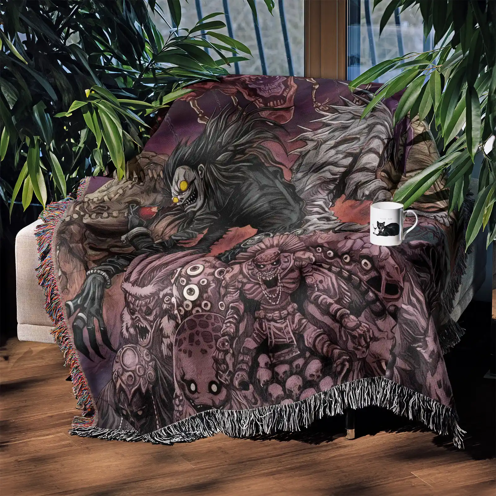 The Death Note Ryuk Woven Tapestry Throw Blanket features a mysterious wall rug, perfect for room and home decor, making it a dark fantasy gift for fans and collectors.