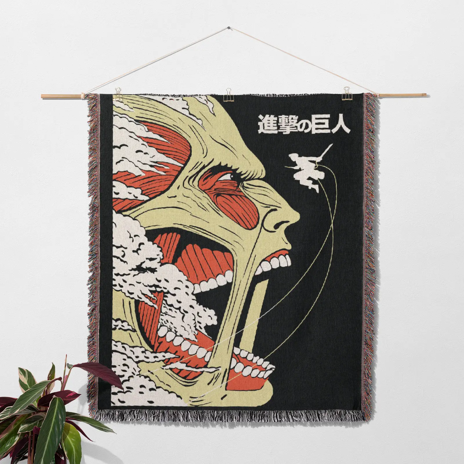 The Attack on Titan Woven Tapestry Throw Blanket features epic wall art, perfect for room and home decor, ideal as a gift for fans.