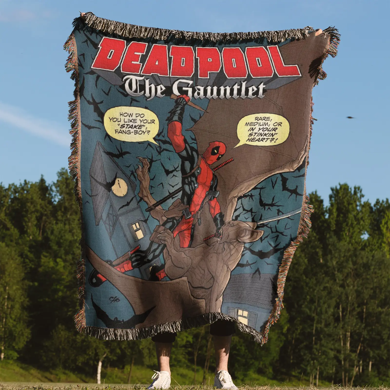 Add fun and color with this Deadpool Comic Cover Woven Tapestry Throw Blanket – Unique Wall Art, Bright Room Decor, Collectible Accent. Made from 100% cotton yarn with rich woven patterns, perfect for walls, beds, or as a cozy decorative throw.