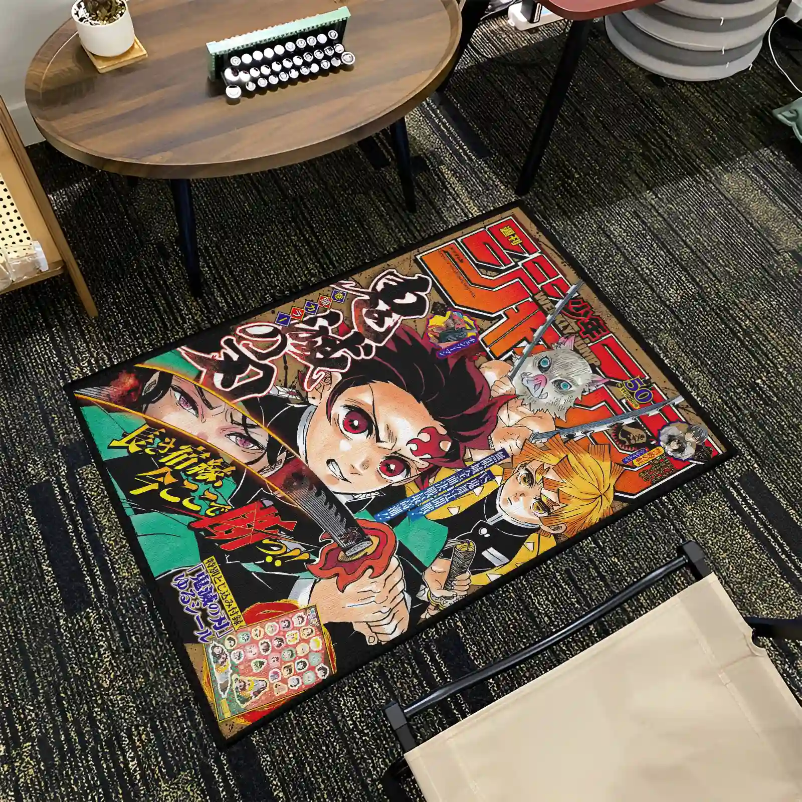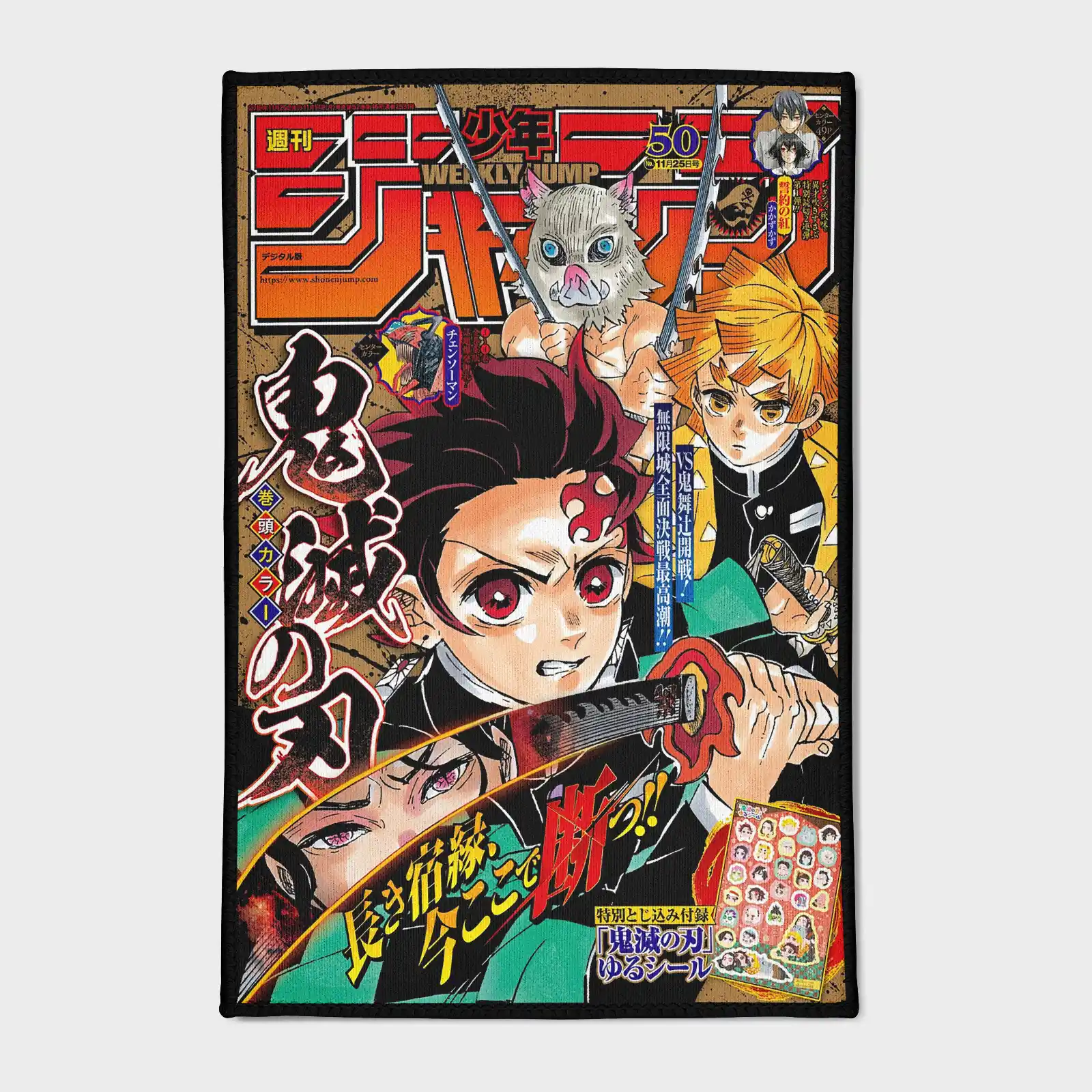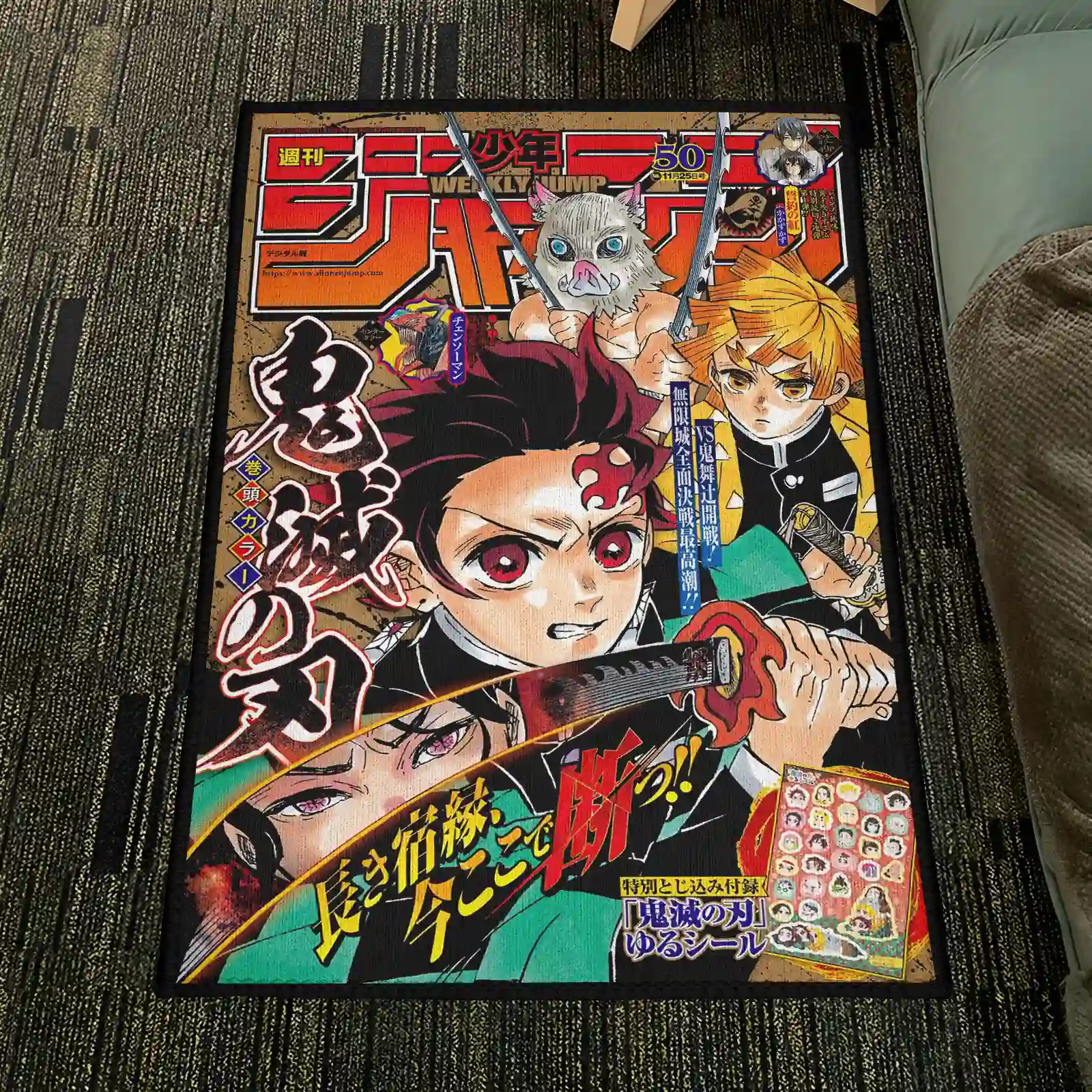 The Demon Slayer Jump Cover Rug features exclusive Jump cover art, perfect for boys’ rooms or otaku gifts. Durable and eye-catching.
