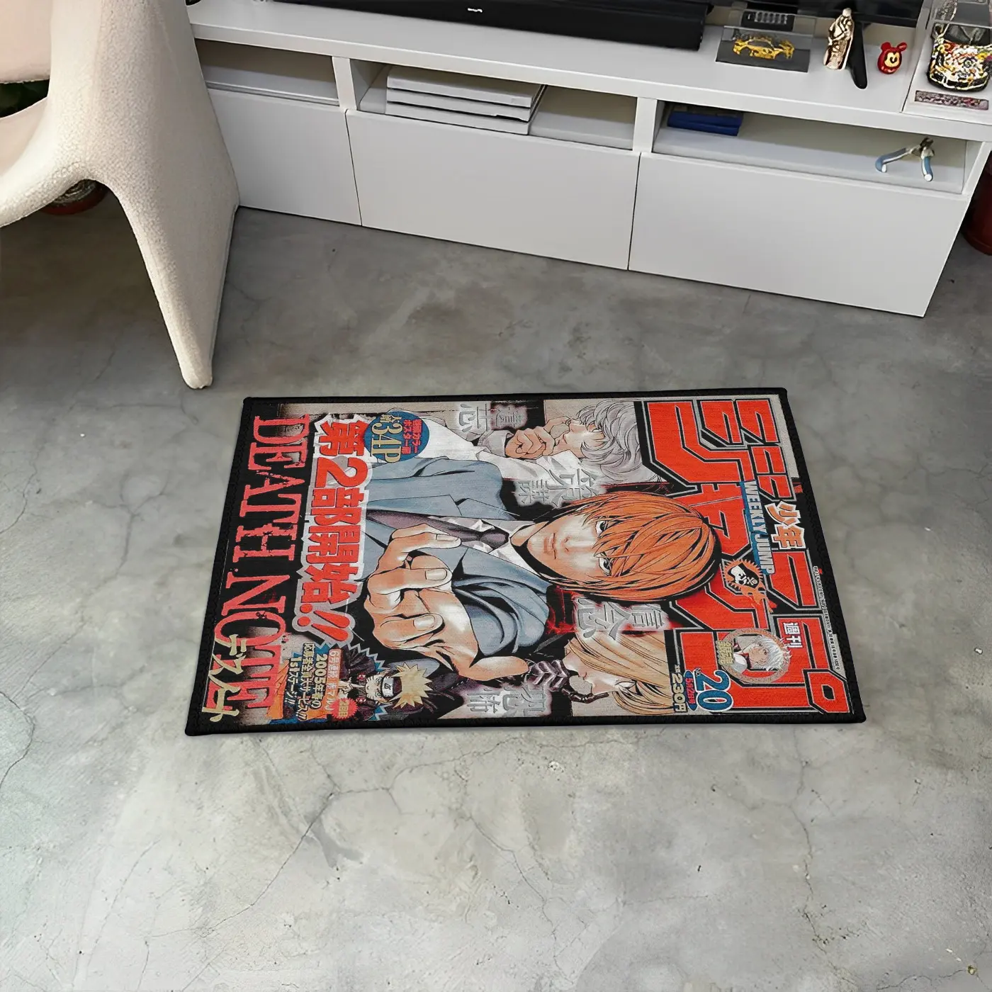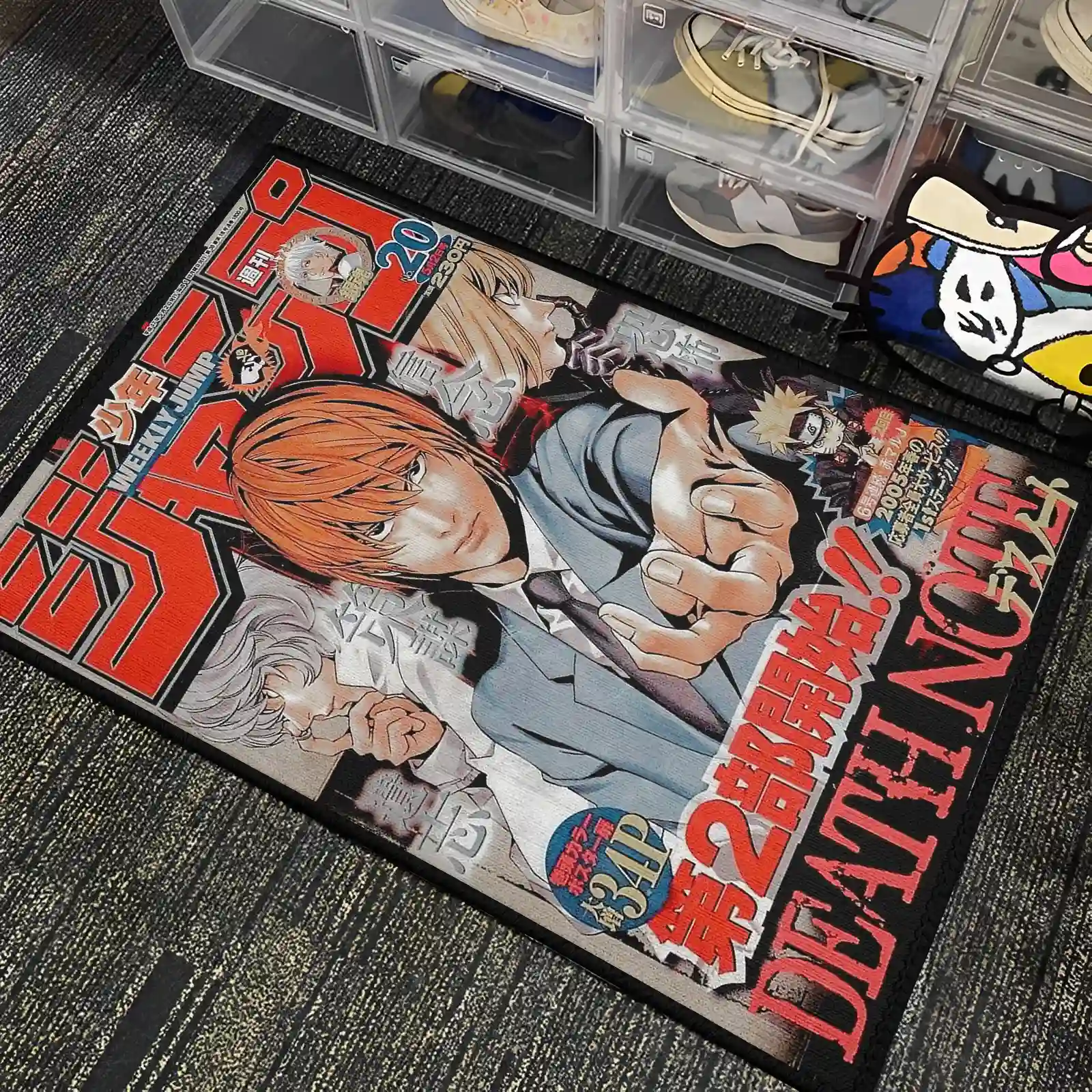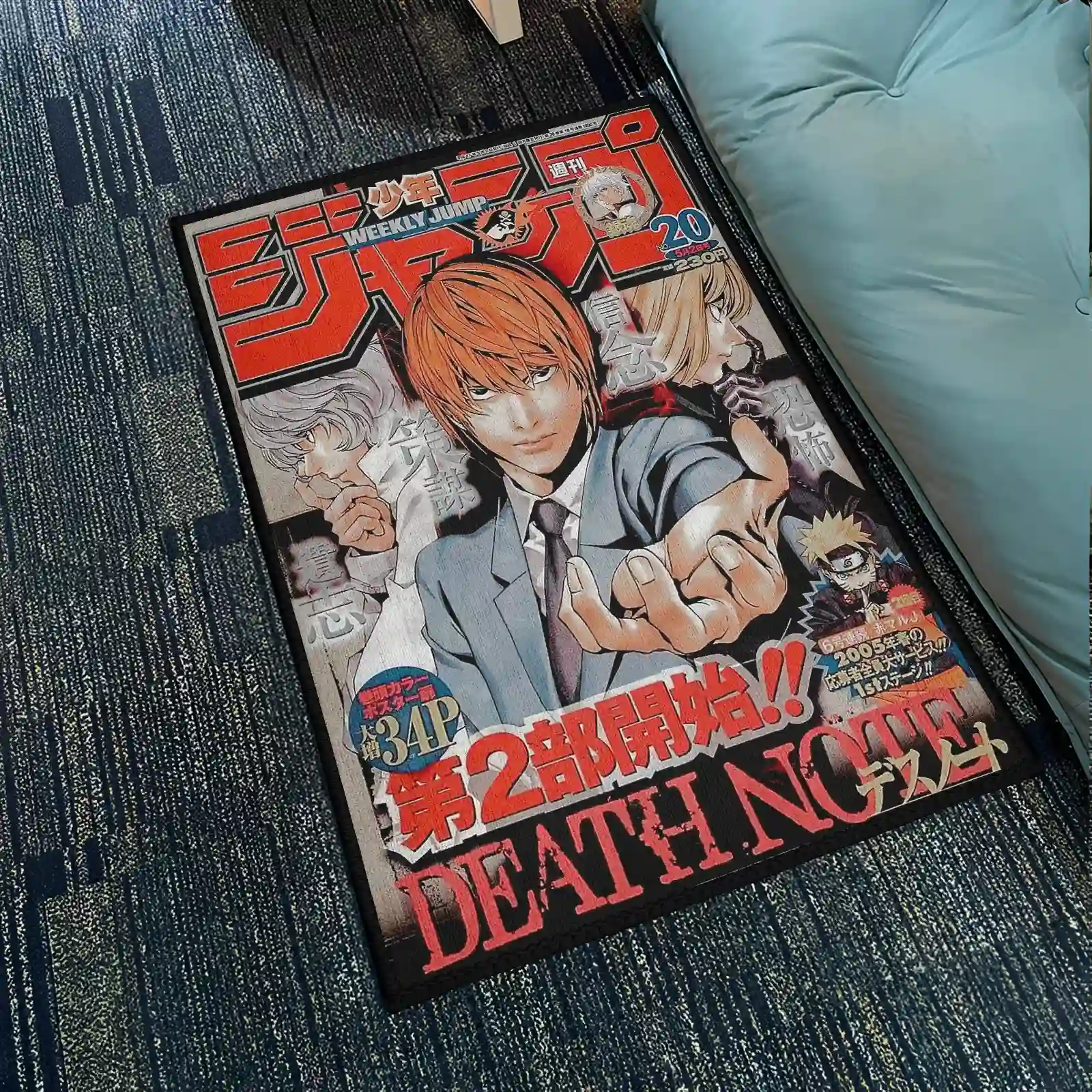 The DN Jump Cover Rug showcases iconic Death Note Jump cover art, perfect for otaku fans and gamers looking to enhance their room decor.