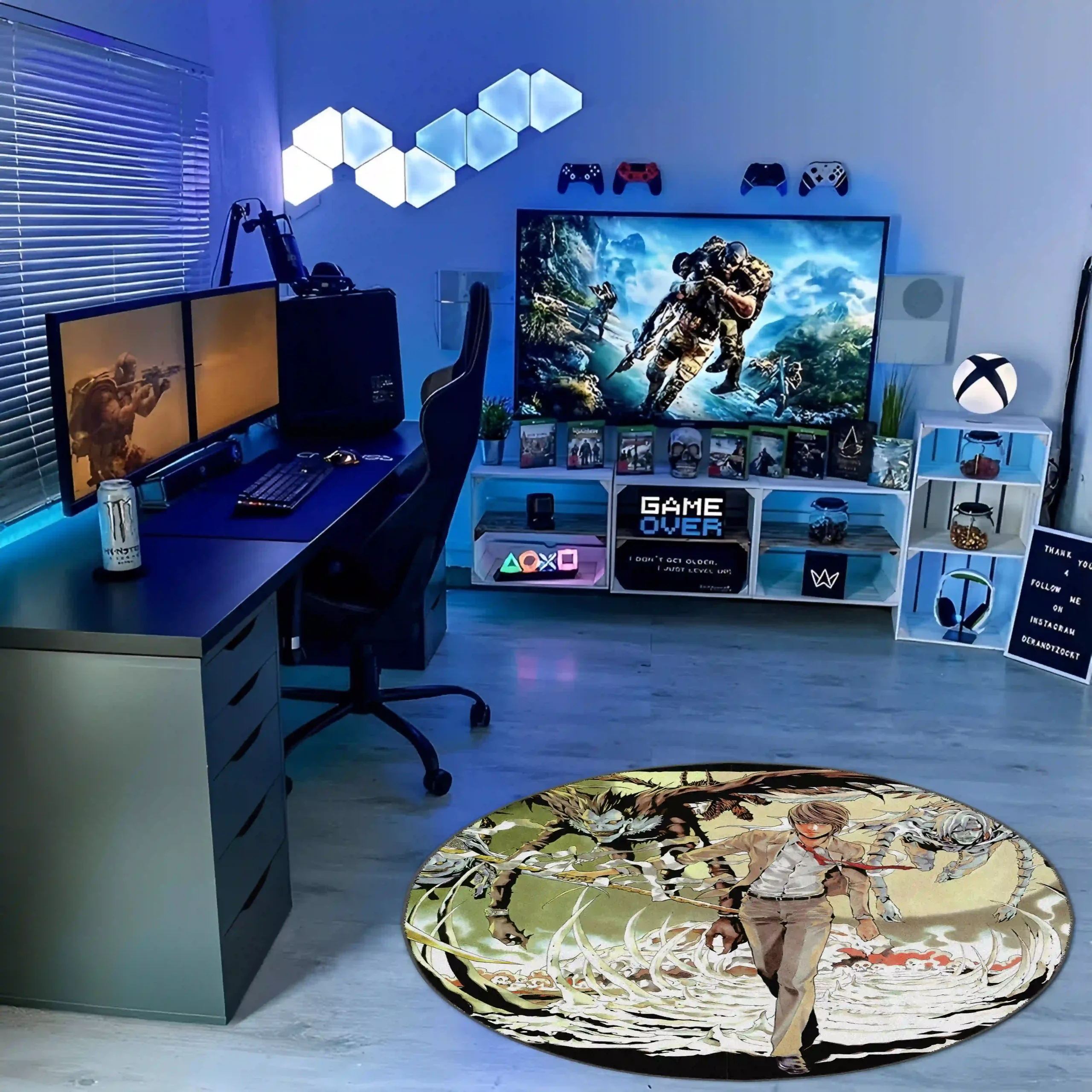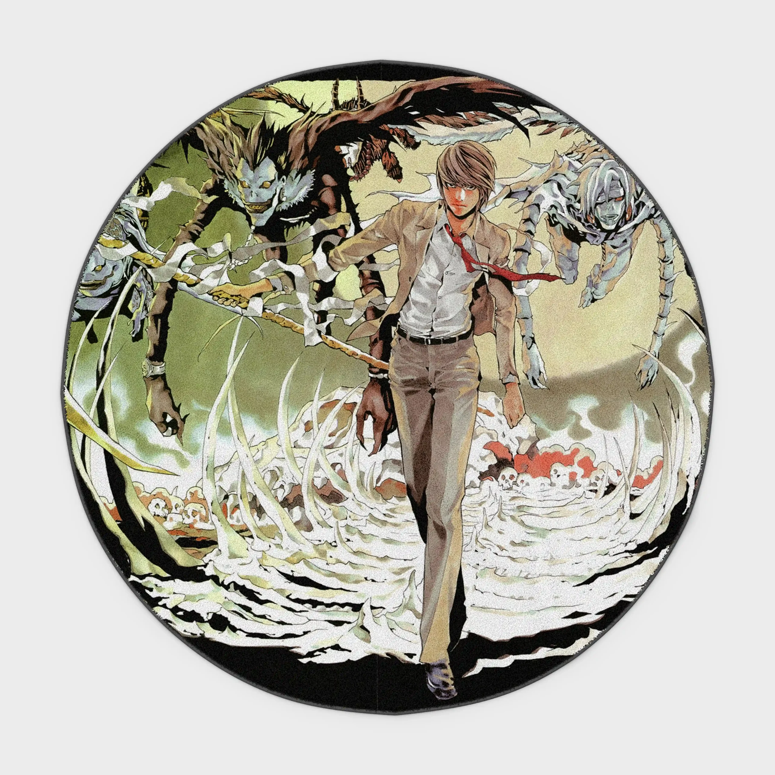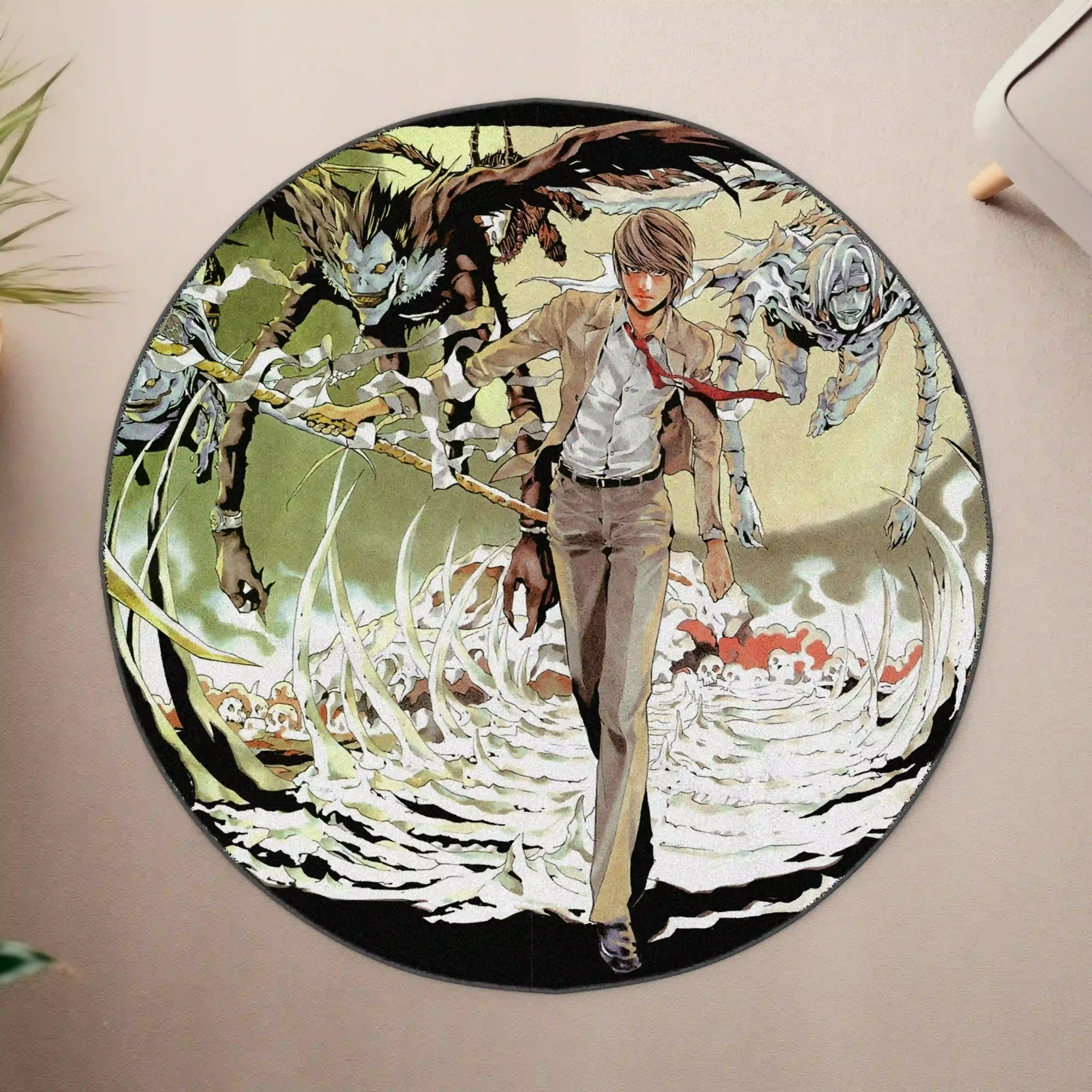 Showcase the intellect and intensity of Light Yagami with the DN Light Yagami Round Rug. This stylish Death Note rug is perfect for anime fans seeking to decorate gaming rooms or bedrooms with a touch of mystery and sophistication. Crafted with soft Raschel velvet and a non-slip backing for comfort and safety.