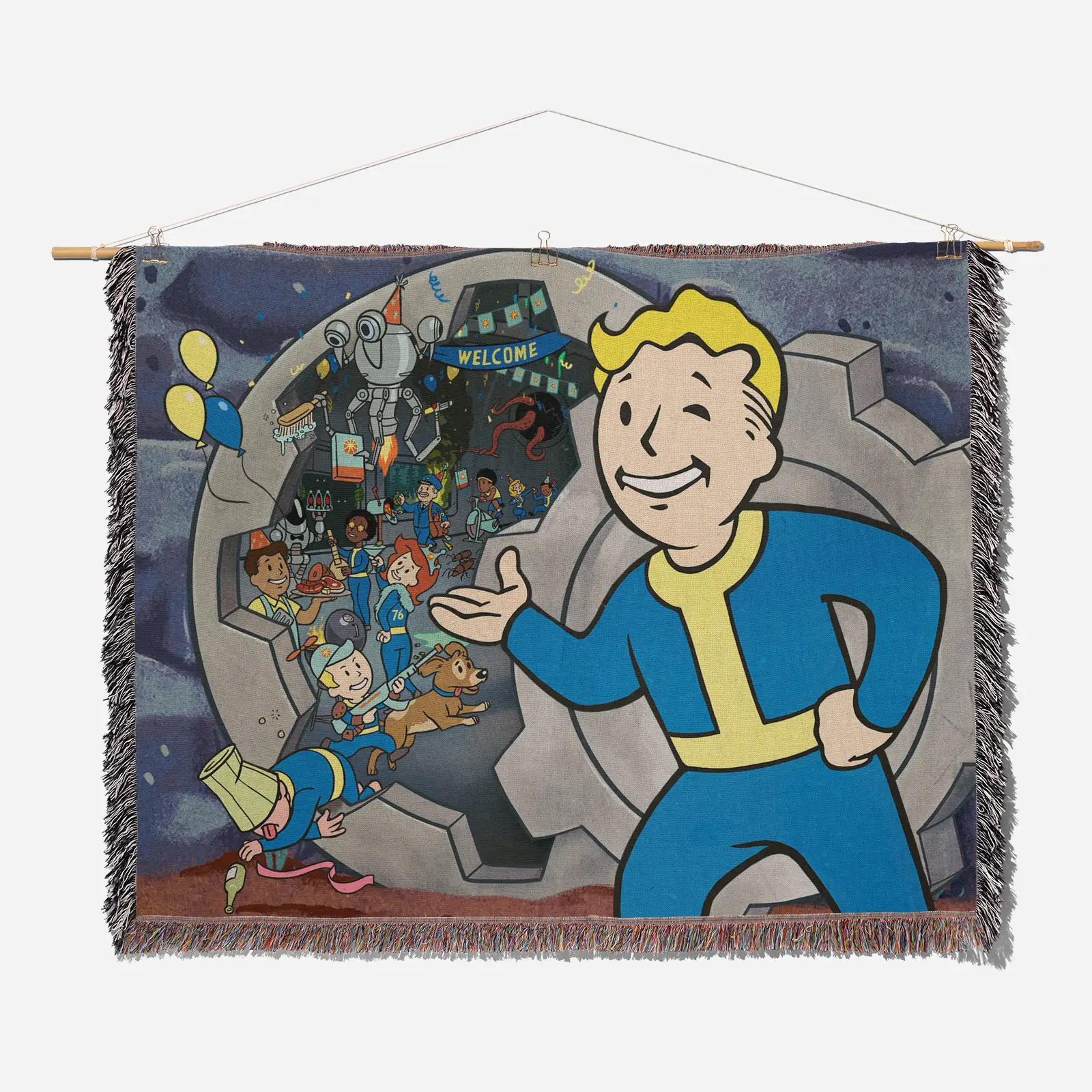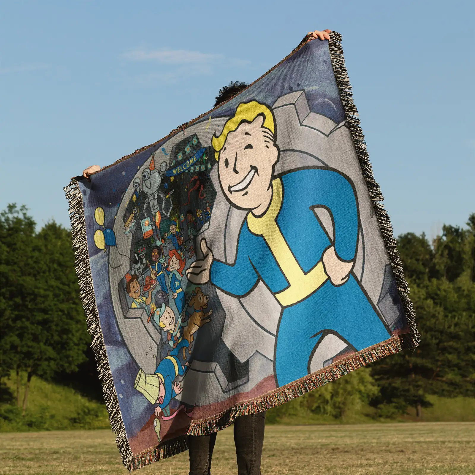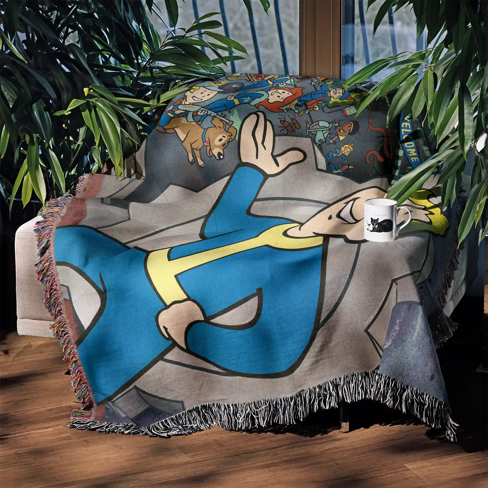 Step into the post-apocalyptic world with this Fallout 76 Woven Tapestry Throw Blanket. Made from 100% cotton yarn, its epic woven patterns make it perfect as wall art, cozy home decor, or a collectible gift for Fallout fans.