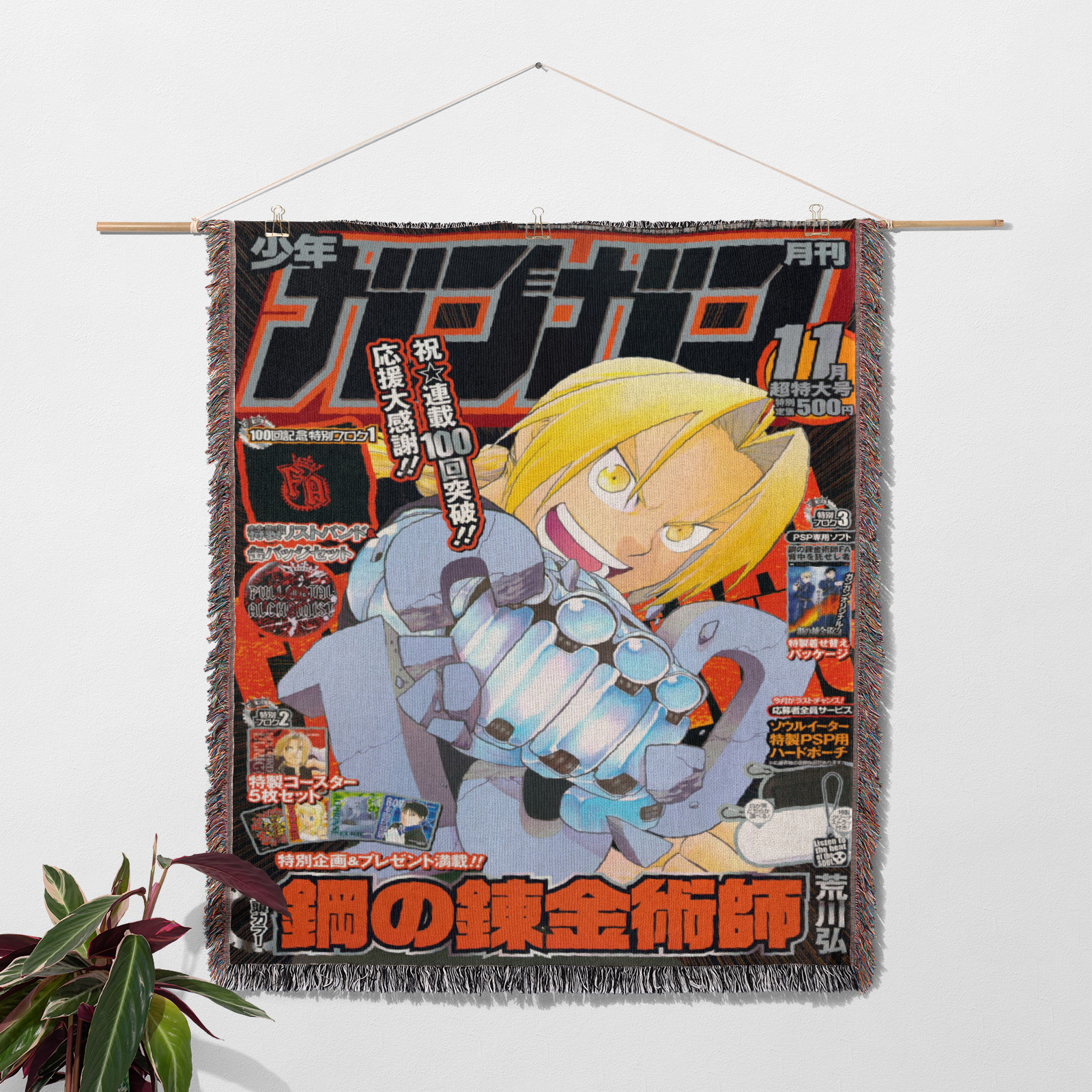 The Fullmetal Alchemist Manga Cover Woven Tapestry Throw Blanket is an iconic wall art piece, perfect for room & home decor and makes an ideal gift for anime fans.