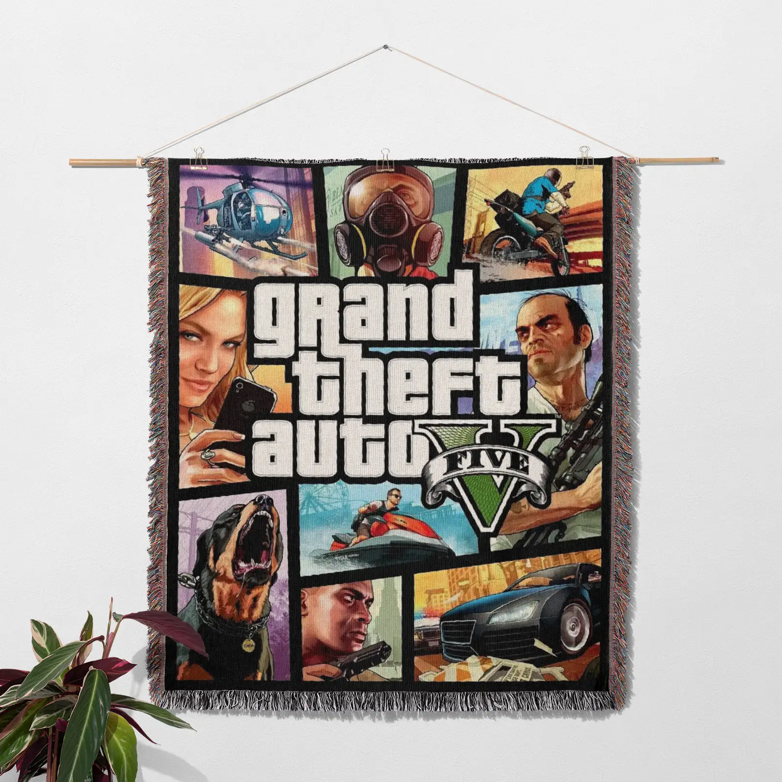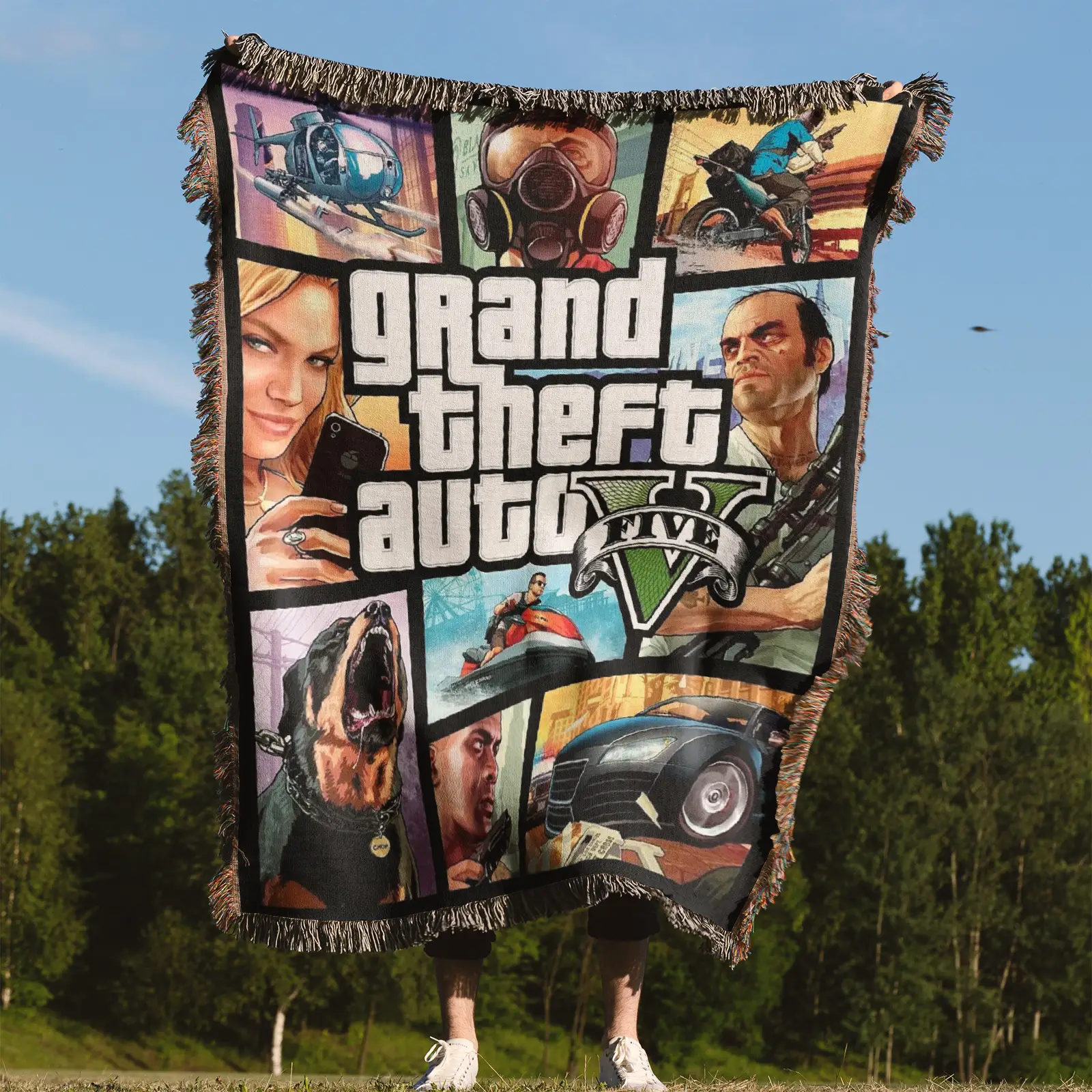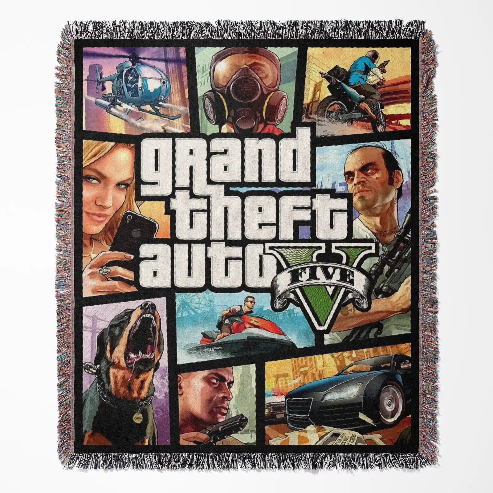 Bring iconic gaming vibes into your space with this GTA CD Cover Woven Tapestry Throw Blanket. Made from 100% cotton yarn, its unique woven patterns make it perfect as wall art, room decor, cozy home decor, or a collectible gift.