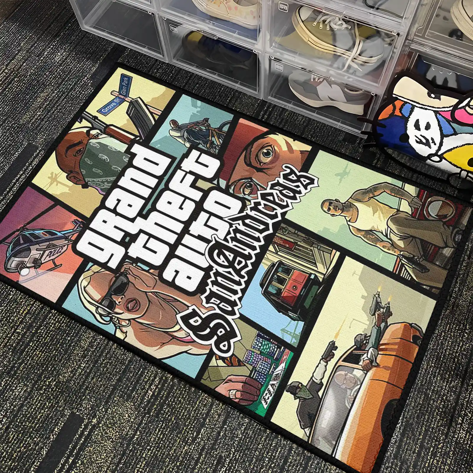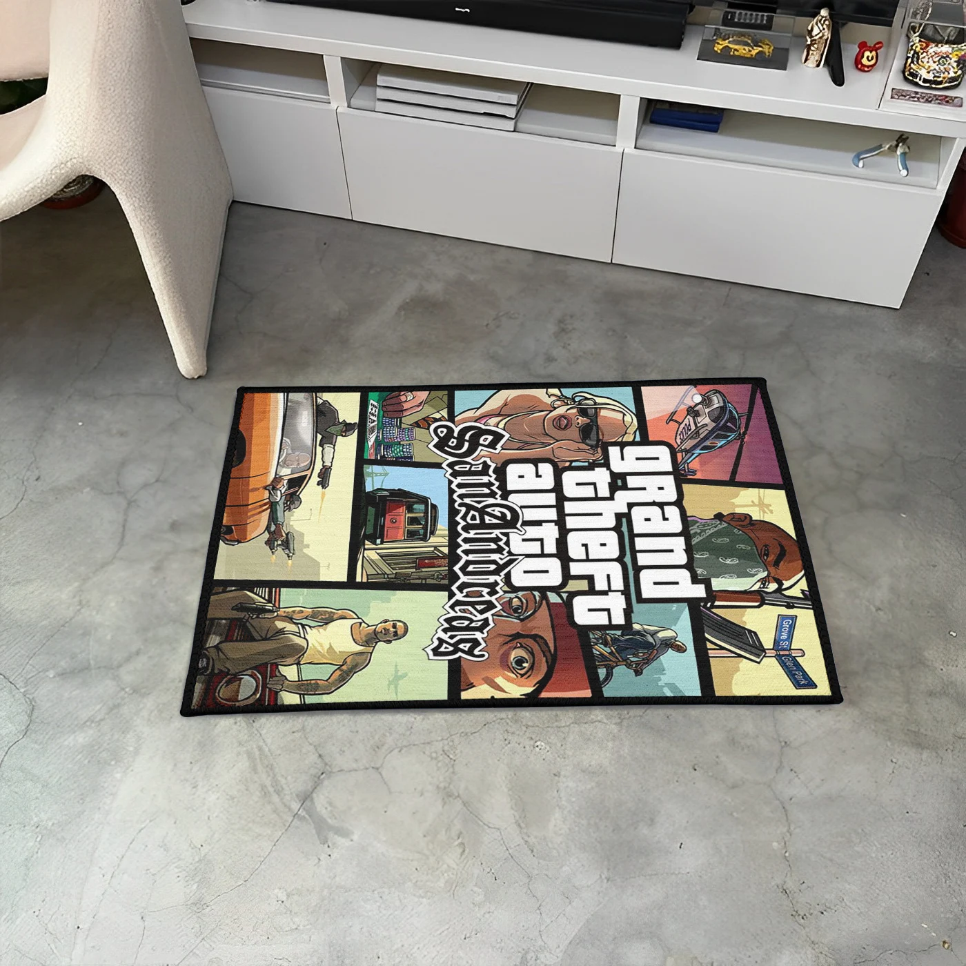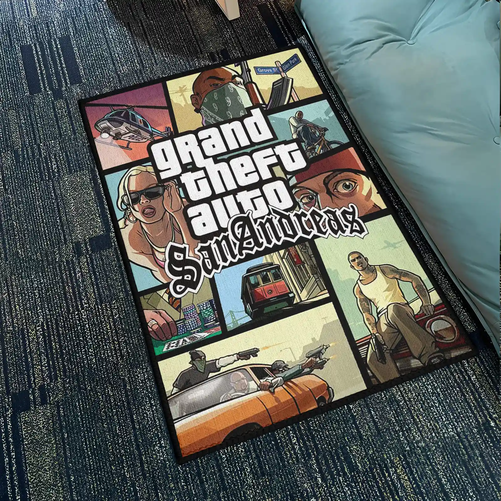 The GTA San Andreas Rug celebrates the classic game with iconic art, ideal for gaming rooms or gamer-themed spaces.