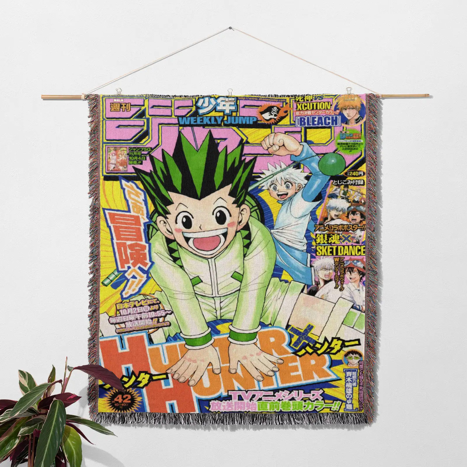 The Hunter X Hunter Manga Cover Woven Tapestry Throw Blanket features collectible woven wall art, perfect for home & room decor, making it a standout gift for fans.