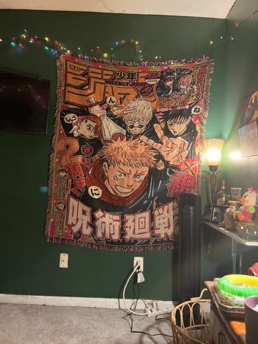 Vibrant and collectible, the Jujutsu Kaisen Manga Cover Woven Tapestry Throw Blanket is perfect as wall art, cozy throw, and room decor for fans of the series.