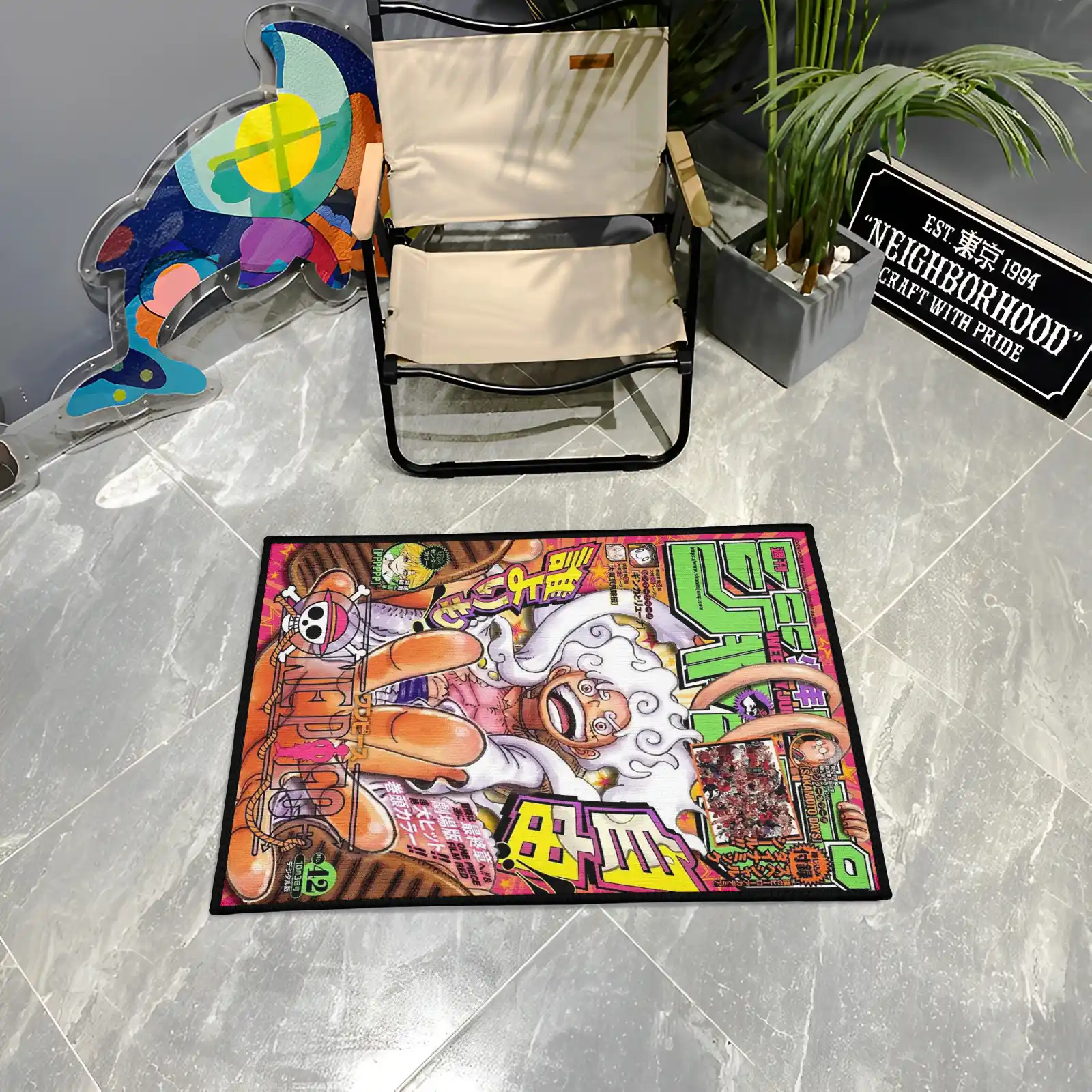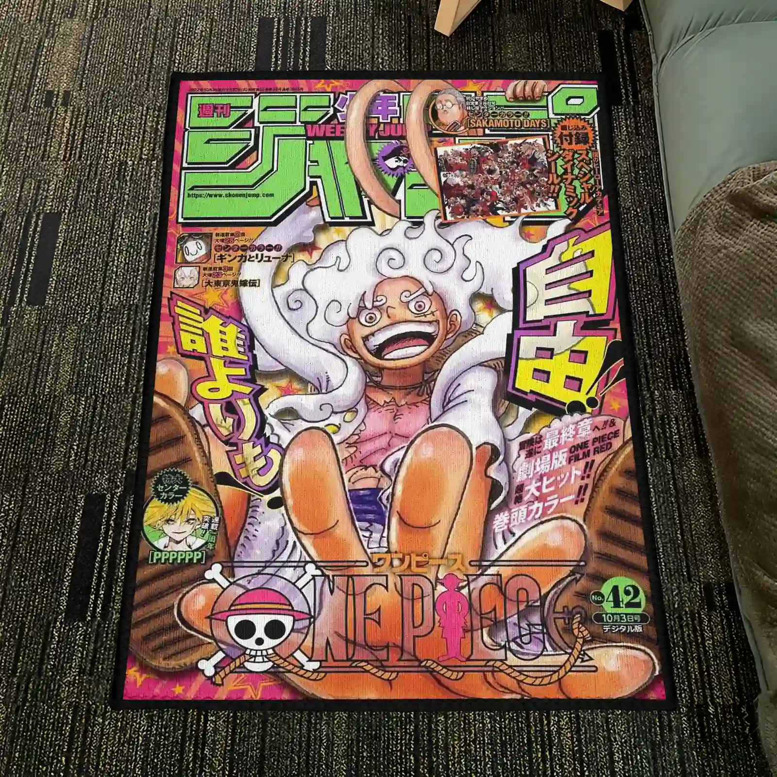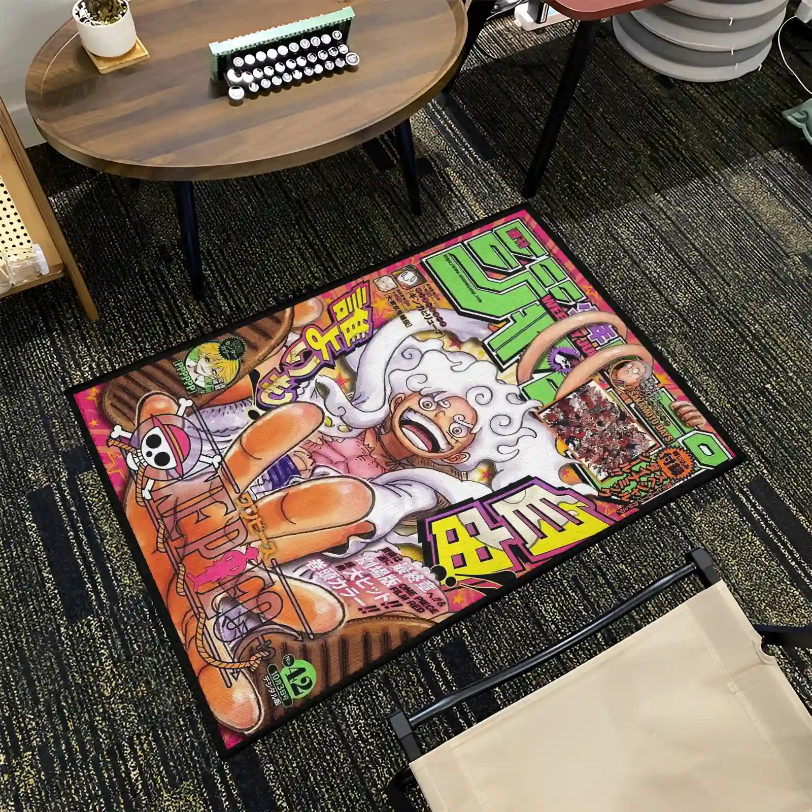 The OP Jump Cover Rug showcases unique One Piece manga art, making it a stylish floor mat and perfect gift for anime fans looking to decorate their space with exclusive merch.