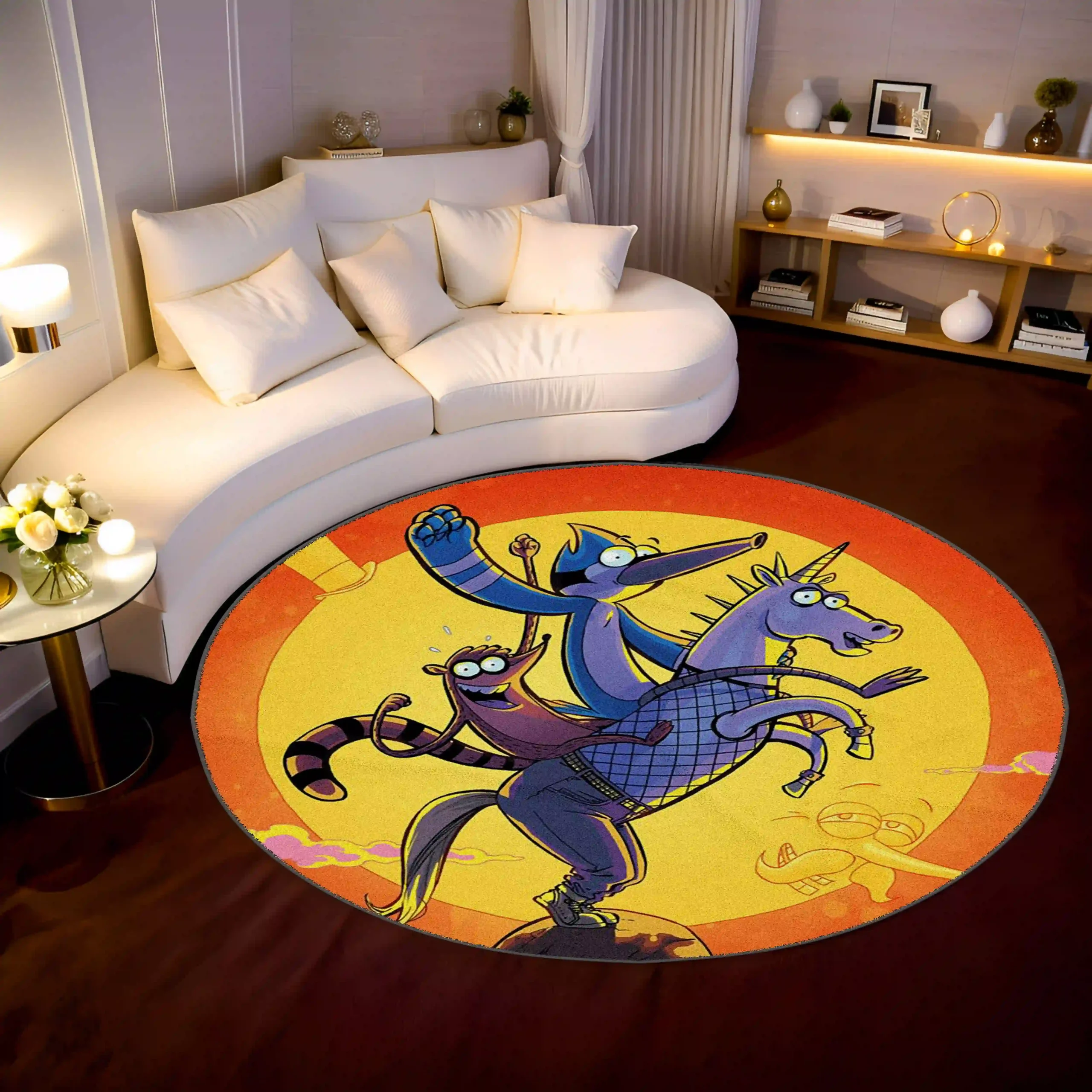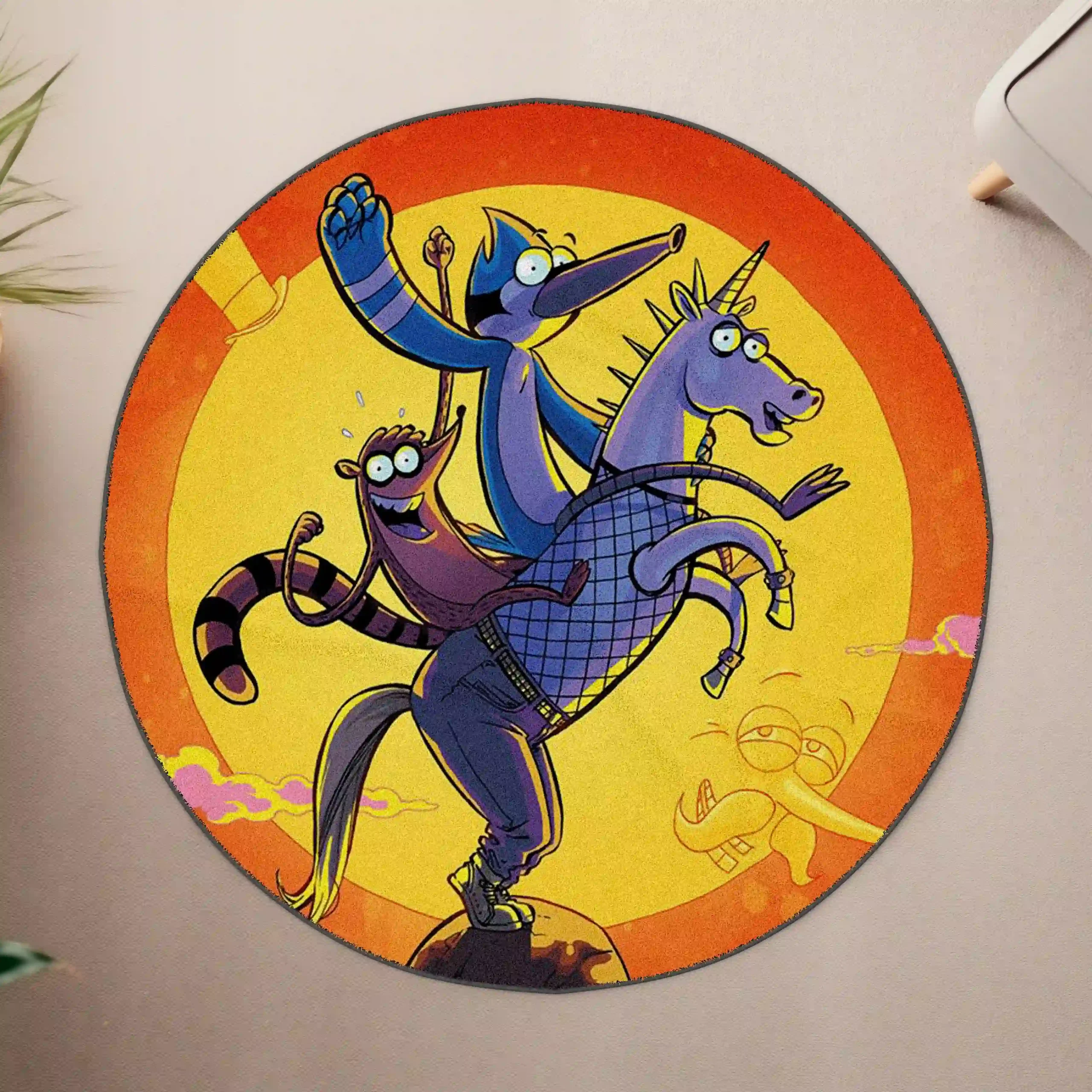 Level up your retro-themed decor with the Regular Show Round Rug. This stylish and nostalgic rug features Mordecai and Rigby, adding quirky charm to any otaku room, media room, or casual lounge space.