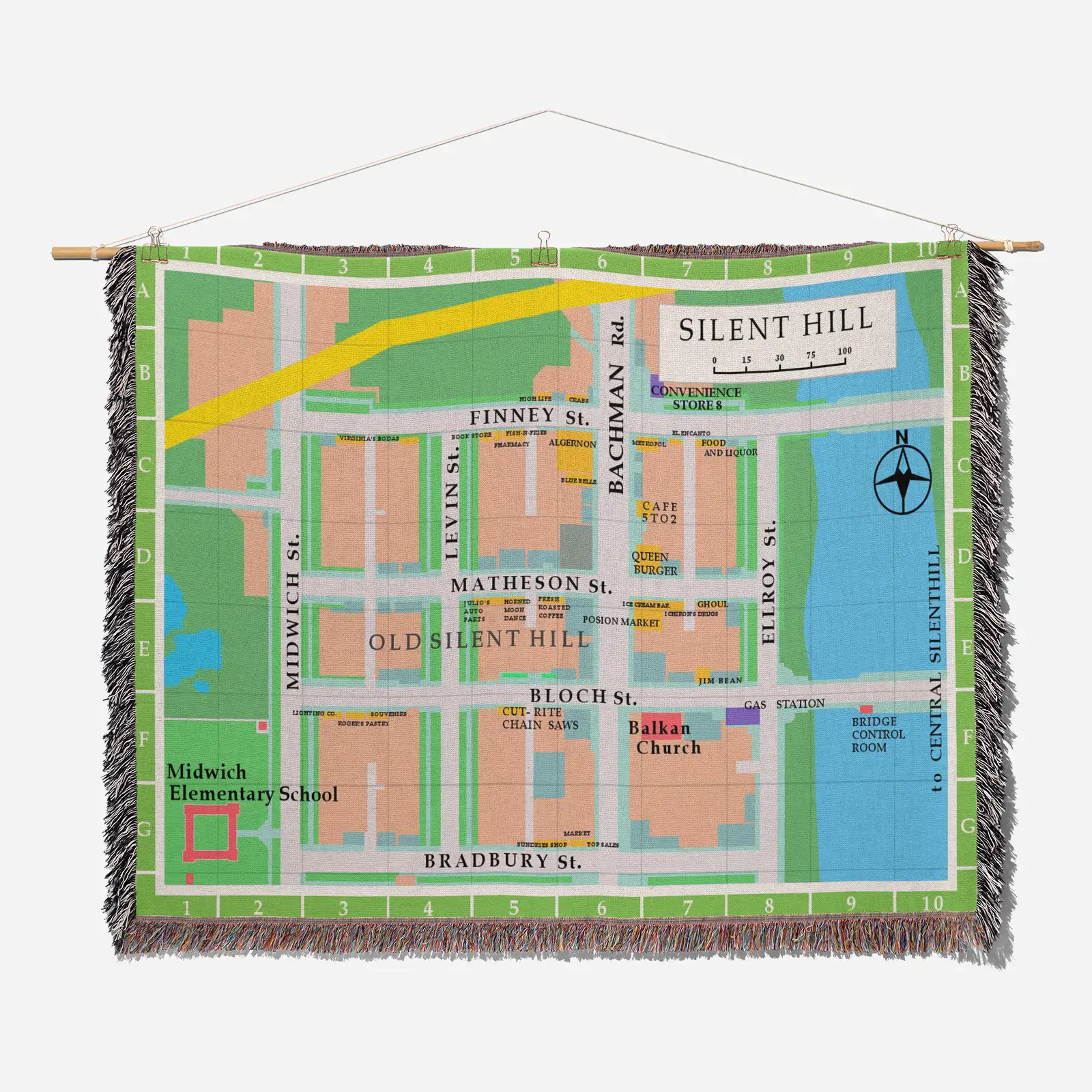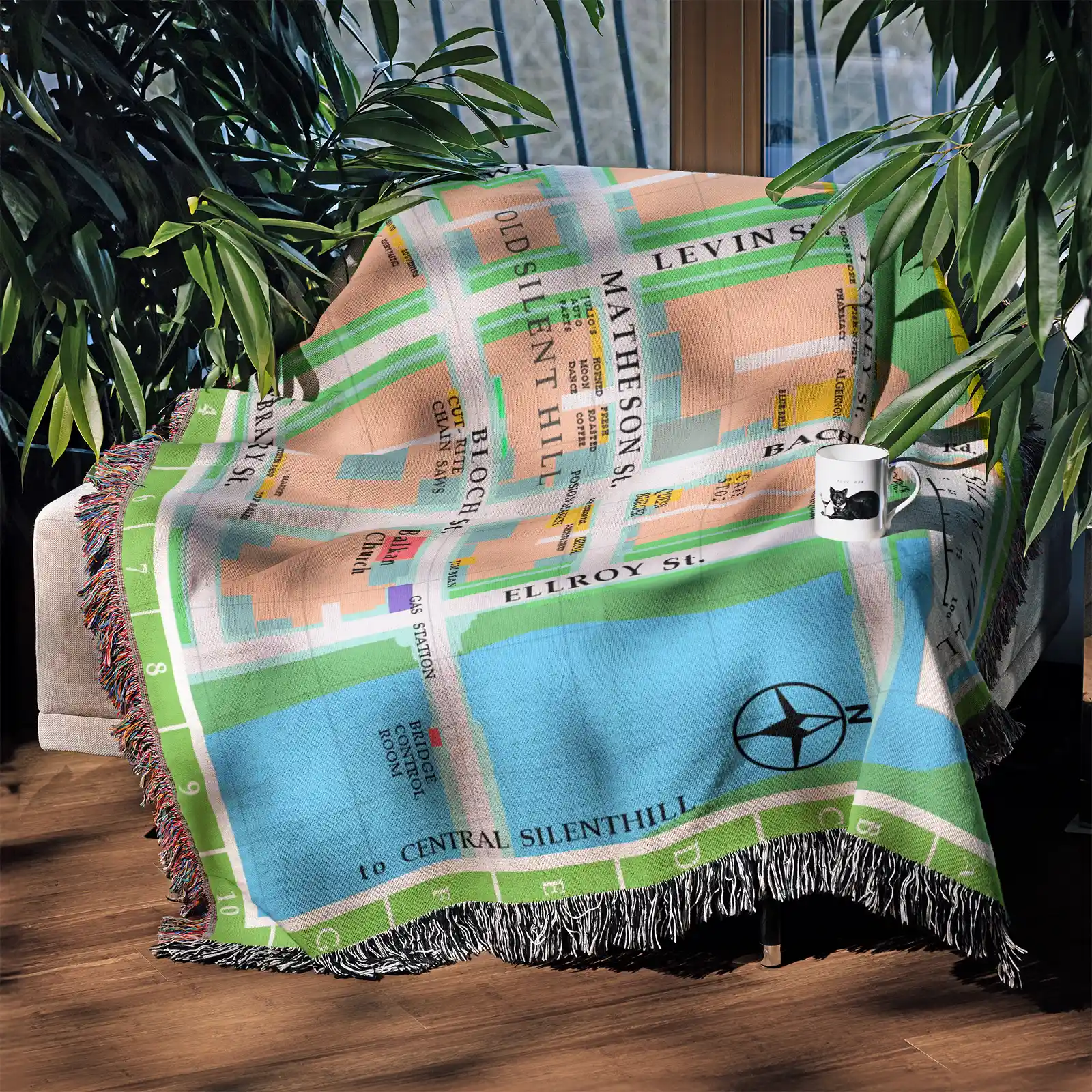 Decorate your room with this Silent Hill Map Woven Tapestry Throw Blanket. Made from 100% cotton yarn, its spooky map-inspired woven patterns make it perfect as wall art, room decor, cozy home decor, or a perfect gift.