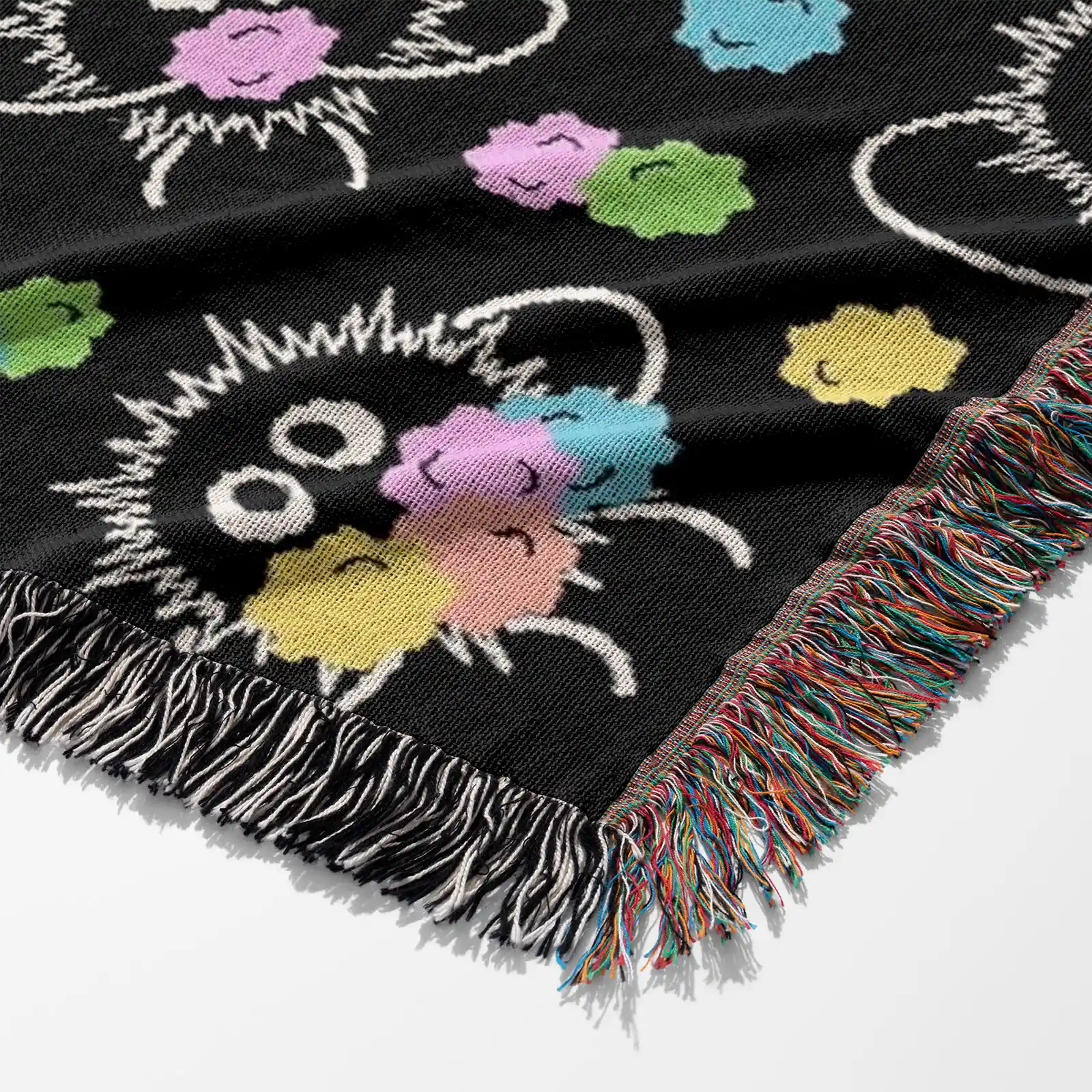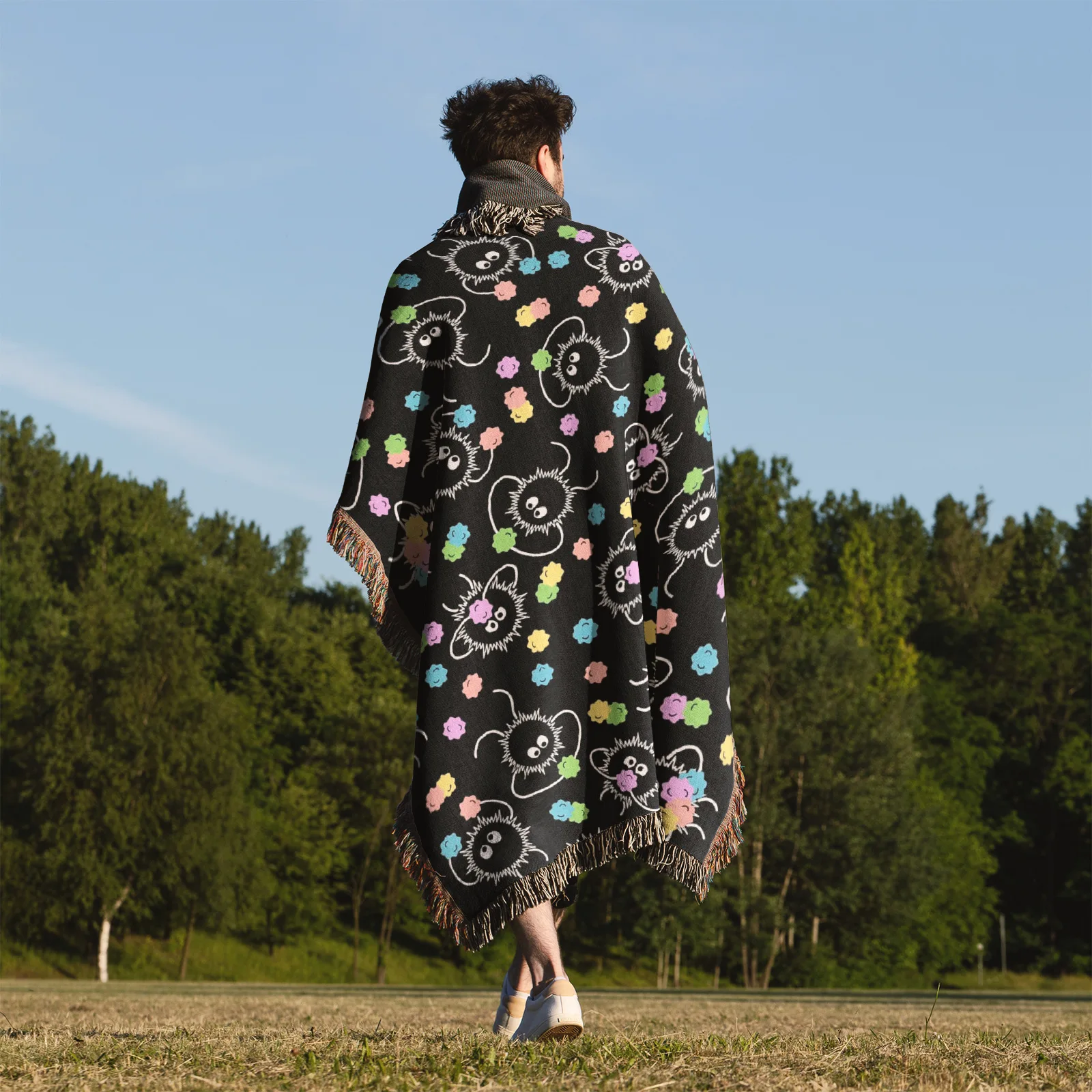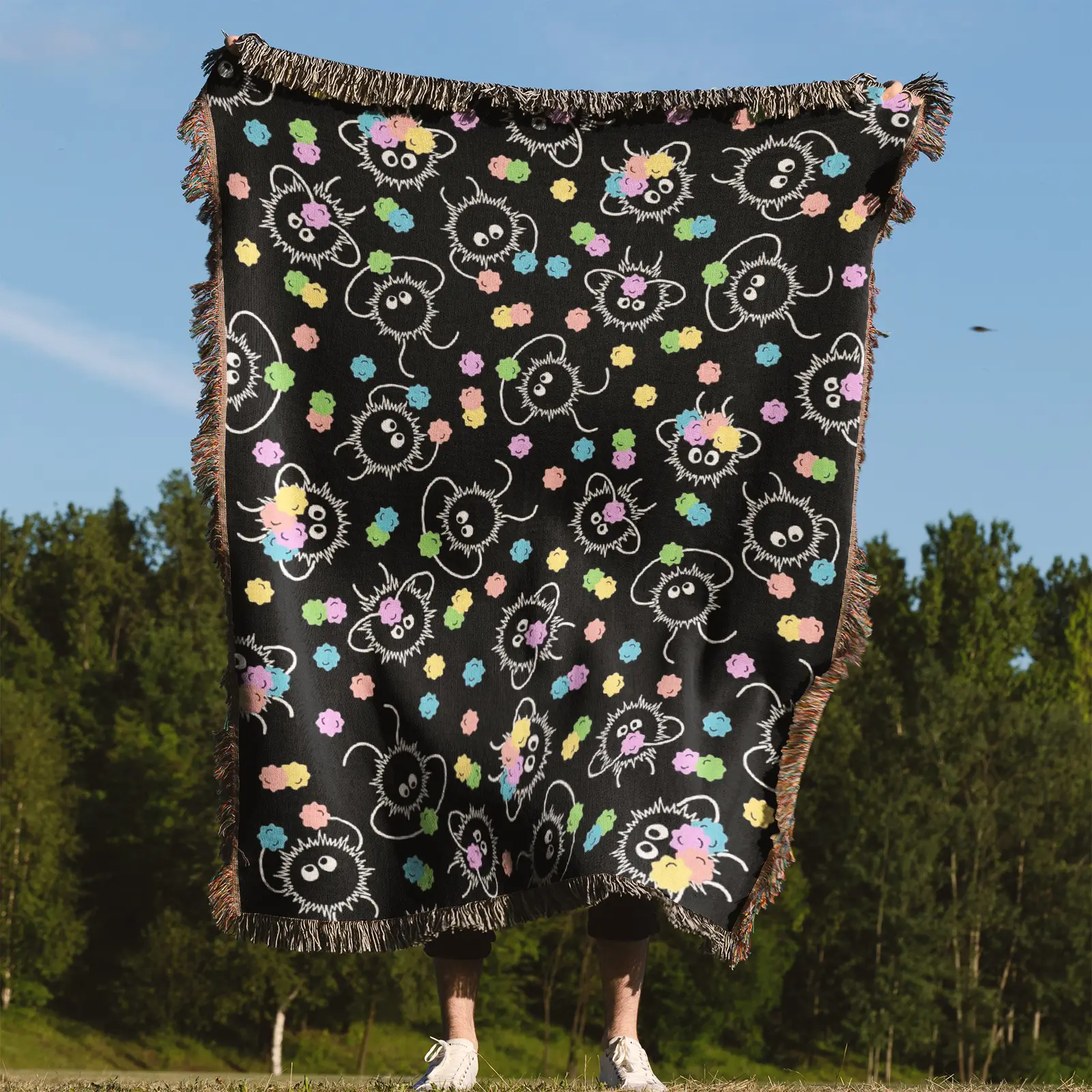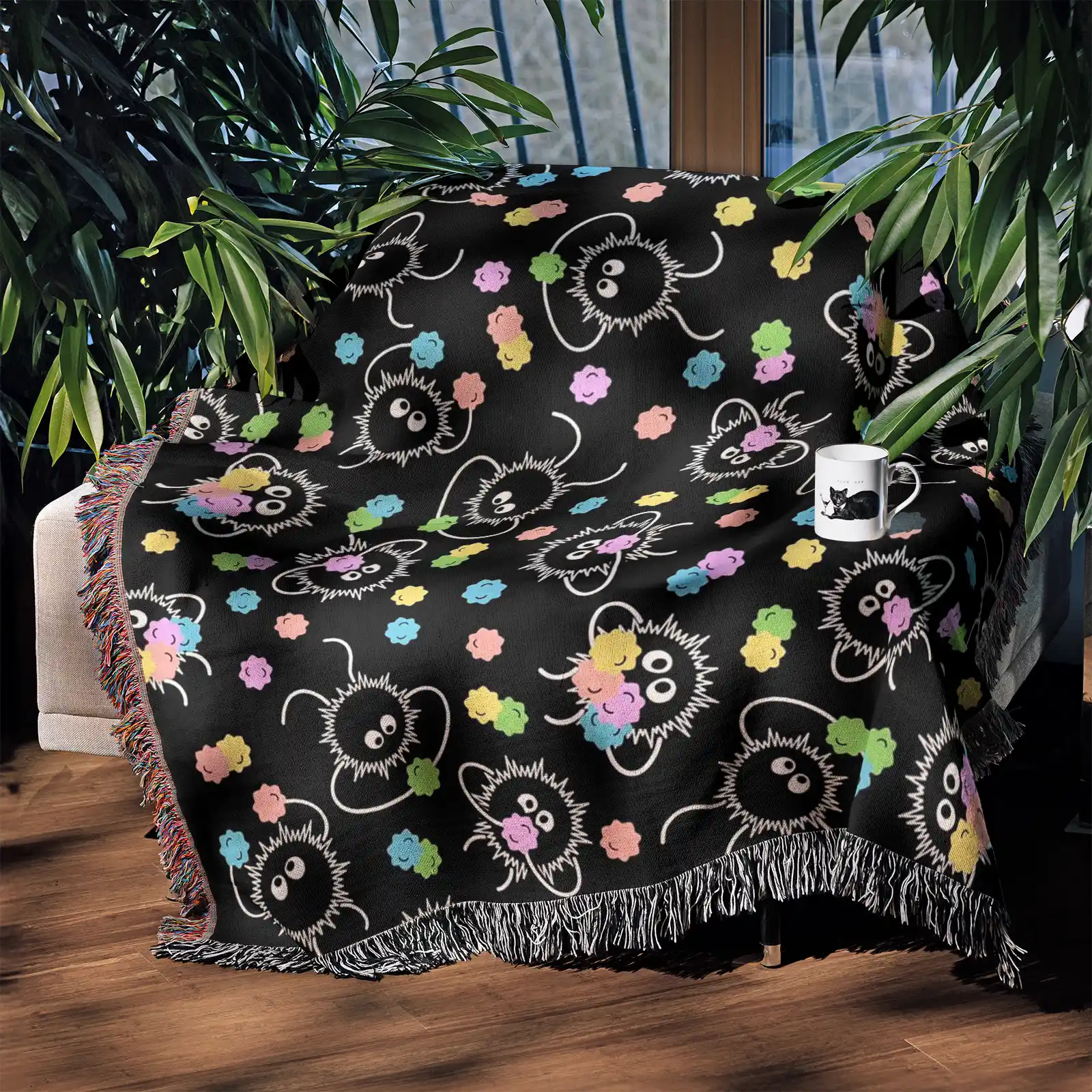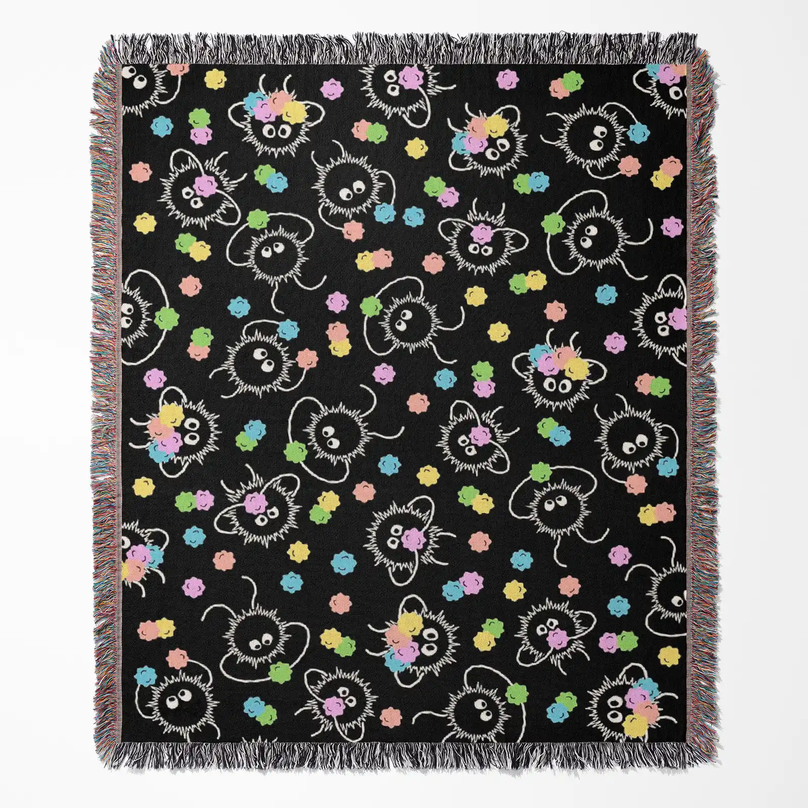 Adorable and unique, the Studio Ghibli Soot Sprite Woven Tapestry Throw Blanket is perfect as wall art, room & home decor, or cozy throw for fans of the film.