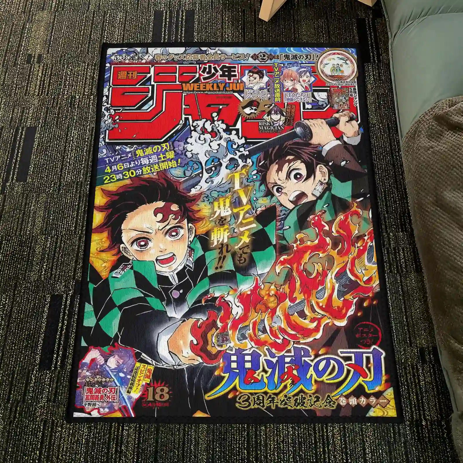 The Tanjiro Jump Cover Rug features unique Demon Slayer Jump cover art, ideal for game rooms or otaku decor. Durable and eye-catching.