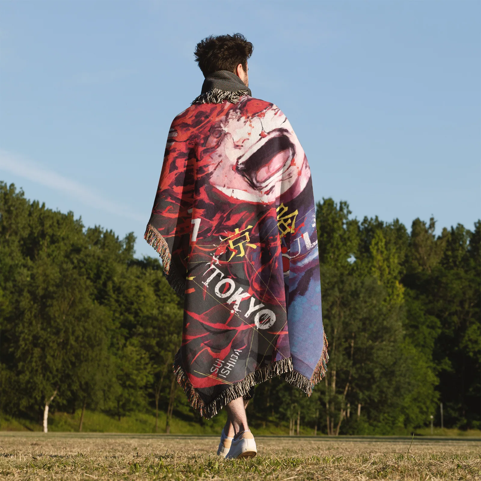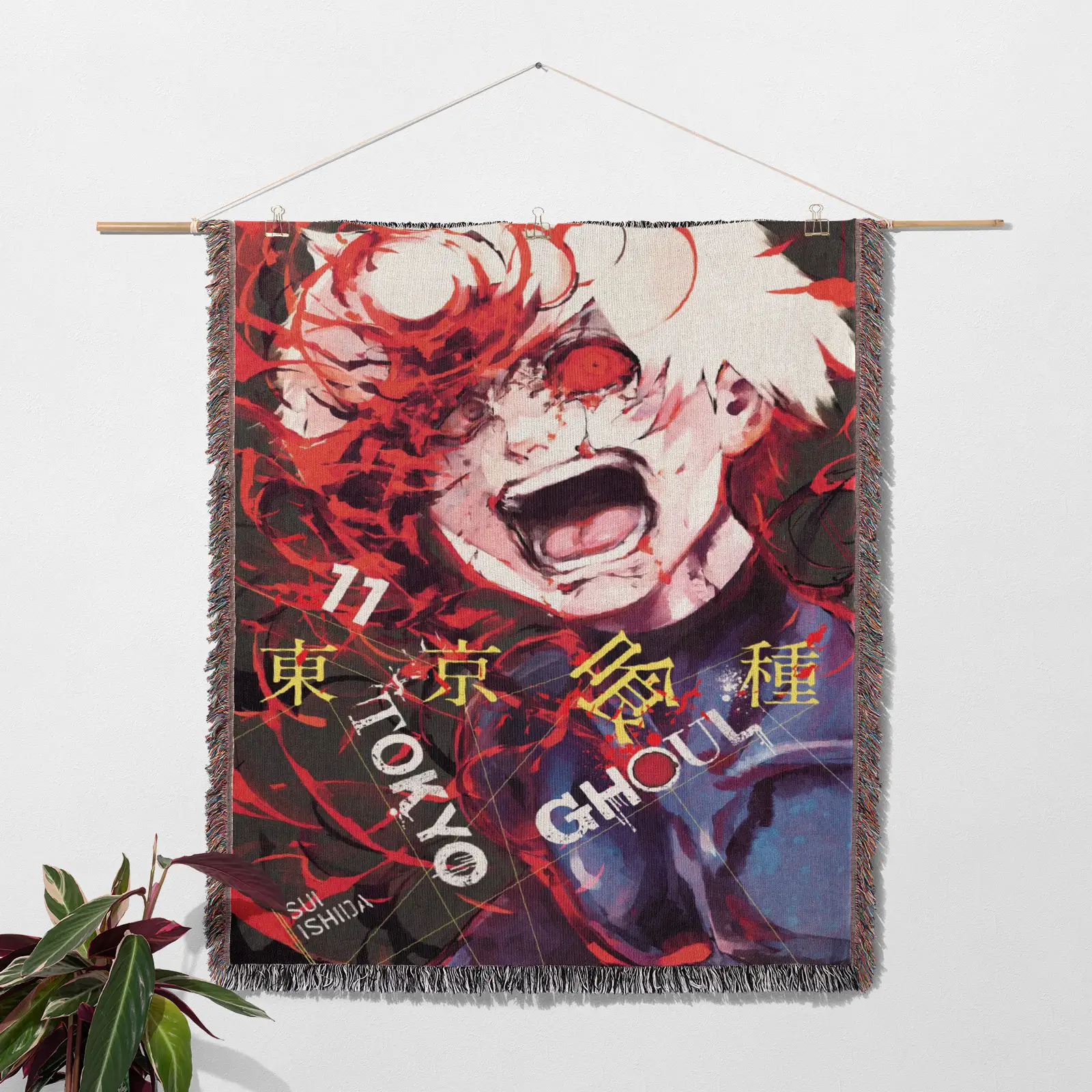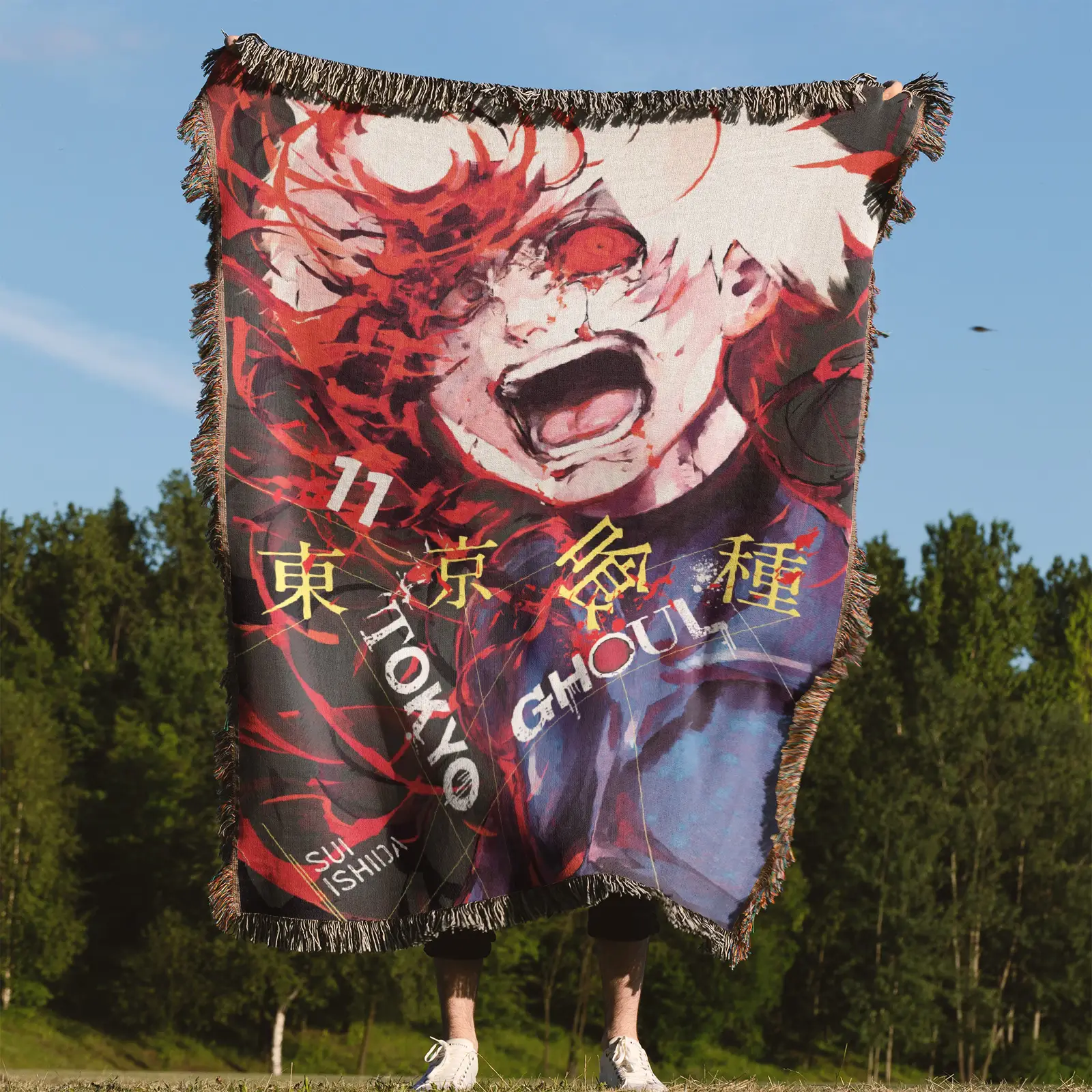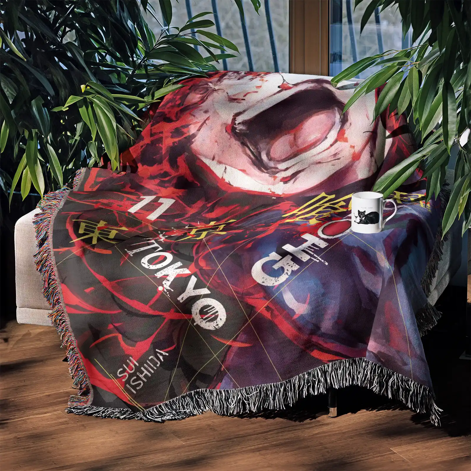 Bring dark, stylish vibes into your space with the Tokyo Ghoul Woven Tapestry Throw Blanket – Stylish Wall Rug, Unique Room Decor, Perfect Gift. Made from premium cotton yarn, this blanket adds an artistic touch to your room decor.