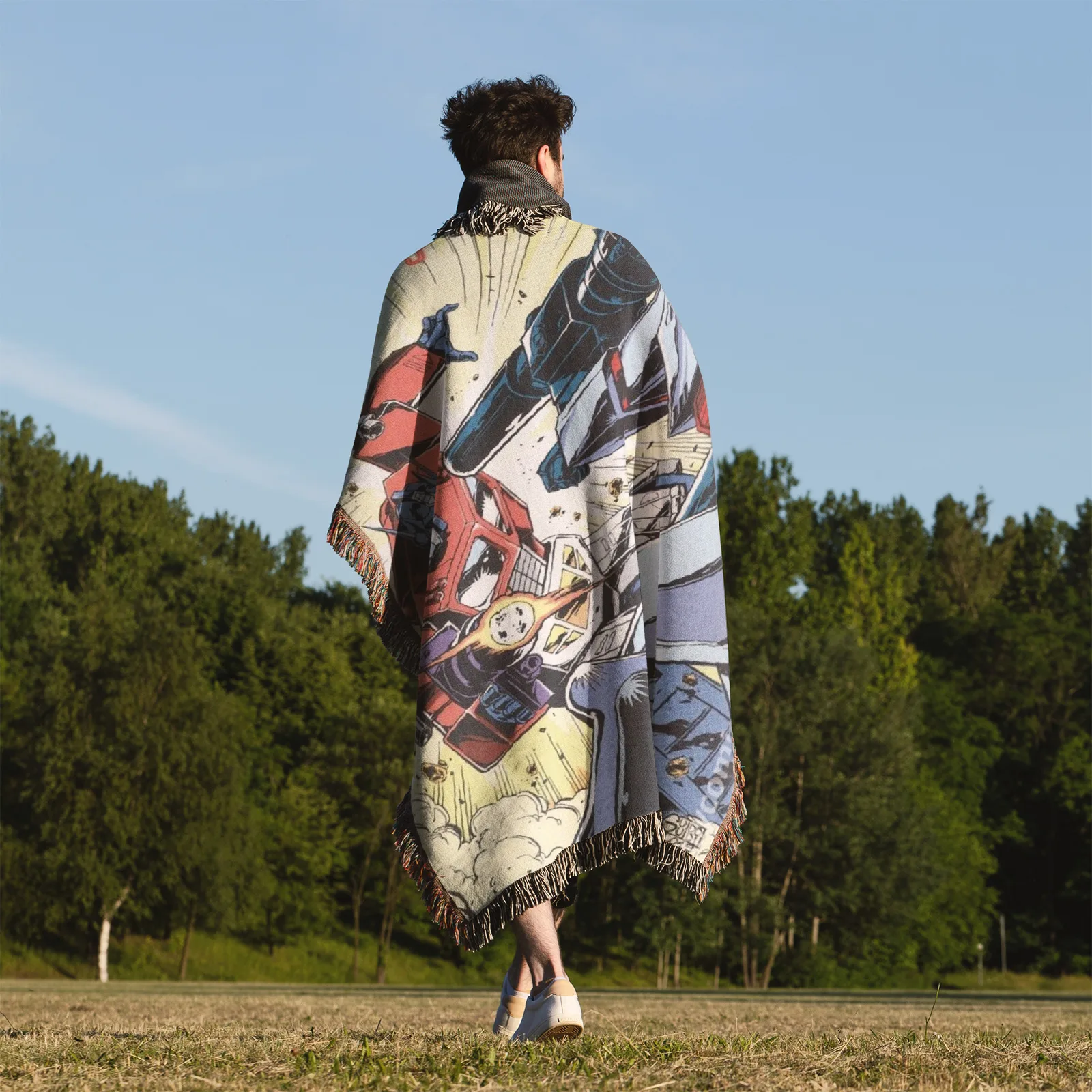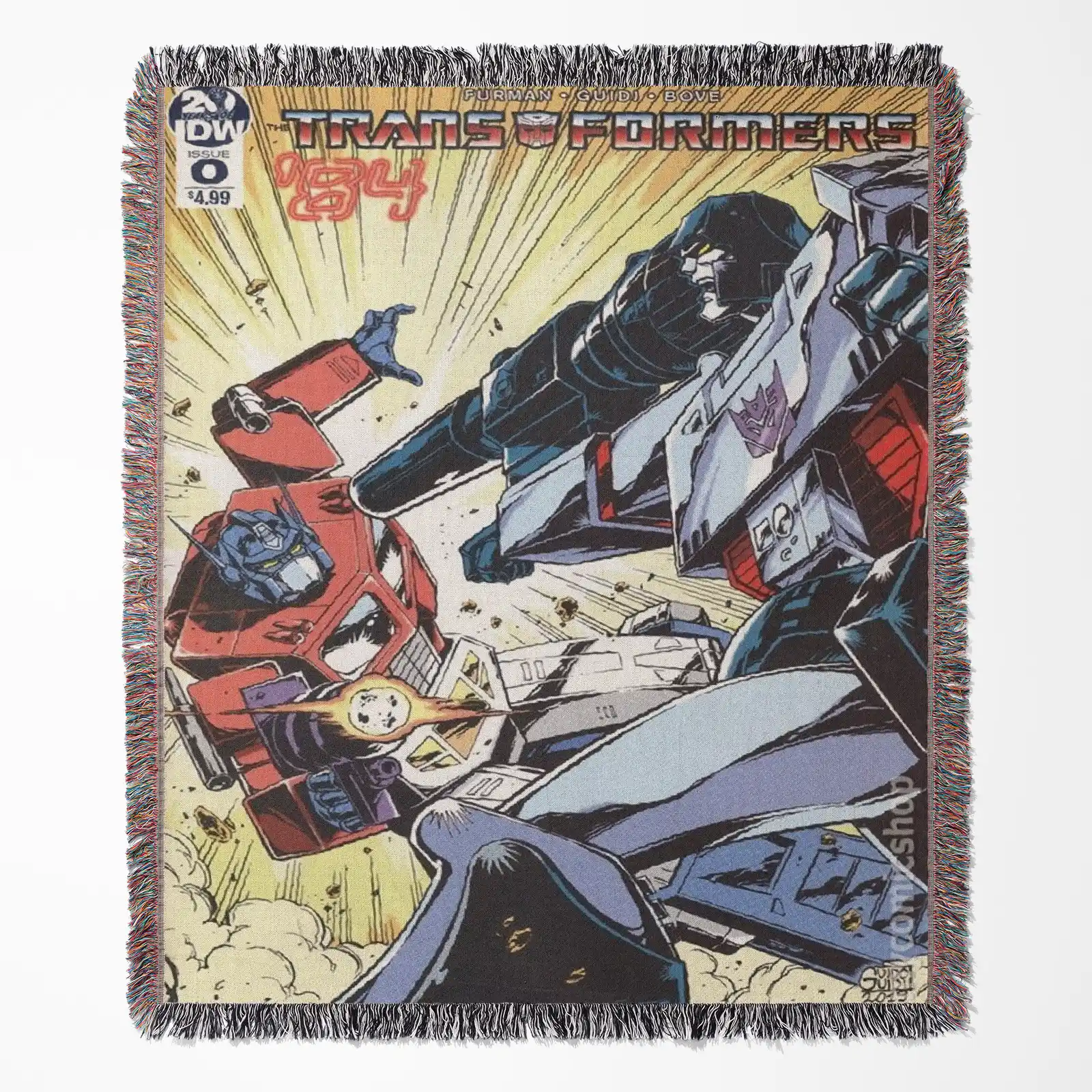 Transformers Comic Cover woven tapestry throw blanket, offering retro wall art and cool room decor, ideal for collectors and fans of the comic.